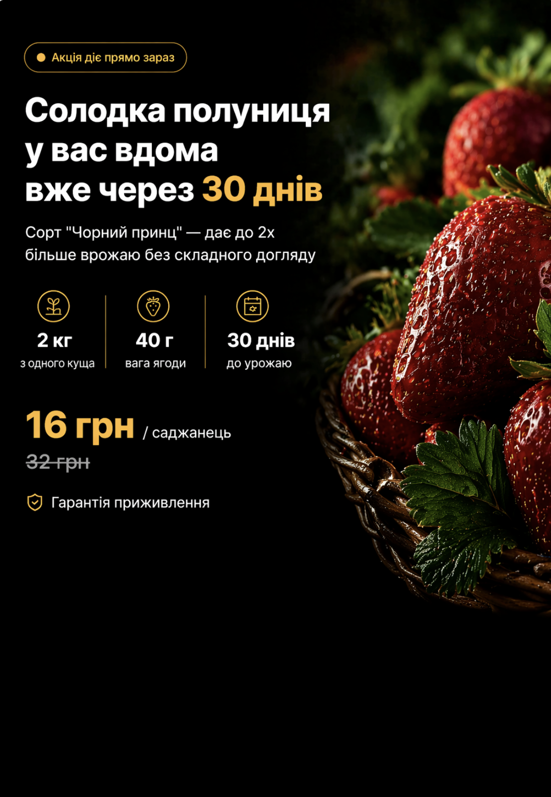 "Замовив 20 кущів. Всі прижились! Вже через місяць збирали перші ягоди. Рекомендую."